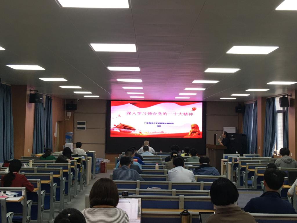 党委在湖光校区海科楼107室举行学习贯彻党的二十大精神宣讲报告会,邀请学校党委理论宣讲团成员、马克思主义学院刘艳副教授作专辅导报告。报告会由学院党委书记陈晓主持,全体教职工参加了会议。