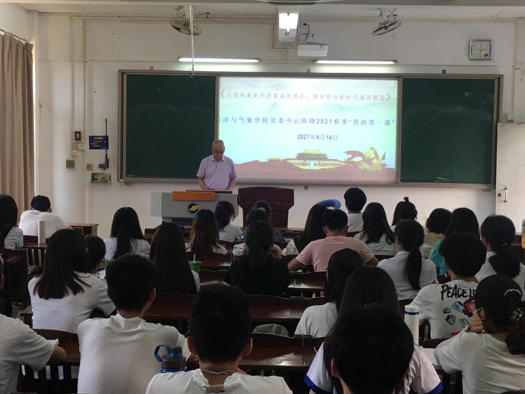 4月14日下午,学院党委书记陈晓在湖光校区钟海楼开讲2021年春季学期党委书记“思政第一课”,他以“从百年党史中汲取成长养分,做好担当新时代海洋强国使命”为题讲授了一堂生动的党史学习教育课。学院学生党员、青马班同学80余人参加。