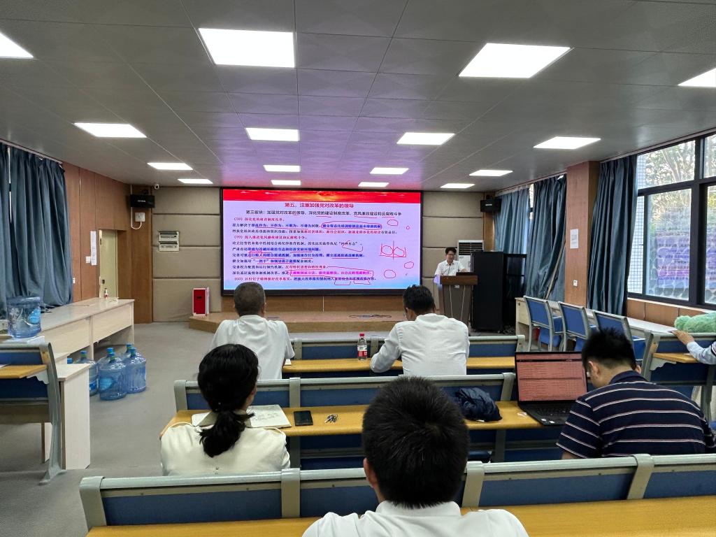 10月30日下午,H视频 在海科楼107会议室举行了学习贯彻党的二十届三中全会精神宣讲报告会。报告会由学院党委书记毛琪主持,学校党委理论宣讲团成员巩建华教授主讲,学院领导、全院教职工和学院全体学生党员近90人参加了报告会。