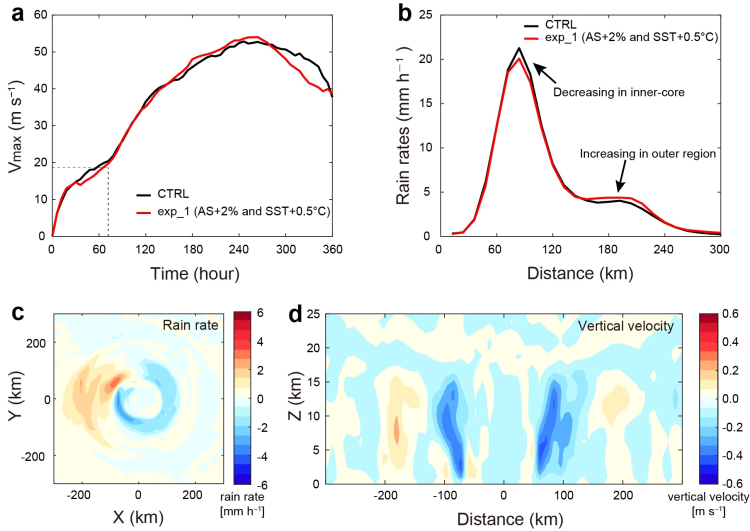 数值实验中台风的强度、降雨率和垂直速度