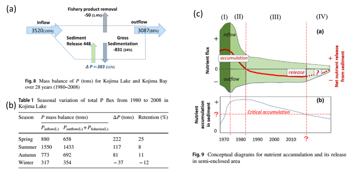 学院海洋化学团队基于对日本濑户内海儿岛湾的长期观测数据,结合表层沉积物,柱状沉积物,水体磷数据和通过沉积物柱重建的磷收支的变化,构建了总长28年的近海磷收支模型。模型指出近海沉积物磷蓄积的明显变化,沉积物磷蓄积量从1980年大约15 g m-2 yr-1即降低到2009年的负值,揭示近海磷库逐渐从蓄积磷转向释放这一过程。沉积物数据和模型数据的对比发现,儿岛湾区域沉积物磷库蓄积的磷为383吨,占整体输入磷的11%,而表层沉积物中整体磷库的大小约为1288吨,约为过去28年磷蓄积量的4倍左右。这一结果也表明,在1980年以前的环境事件造成的磷蓄积量远超现在,而且仍然在持续影响目前区域磷循环过程,沉积物临界蓄积量的指标实际上是衡量区域富营养化恢复与否的重要指标。研究最后总结近海富营养化对富营养化治理响应的4个过程,即,1、输入营养盐增加,输入大于输出,此时临界蓄积量快速增加;2、通过治理,输入营养盐开始减少,但输入大于输出,临界蓄积量停止增加;3、输入营养盐持续减少,输出大于输入,沉积物磷库开始调节磷循环过程,此时临界蓄积量开始减少;4、输入持续减少,输出大于输入,沉积物磷库对磷循环的调节过程接近稳定,此时临界蓄积量接近0或为负值。实际只有等到第四个步骤才接近完成了整个富营养化恢复的过程。