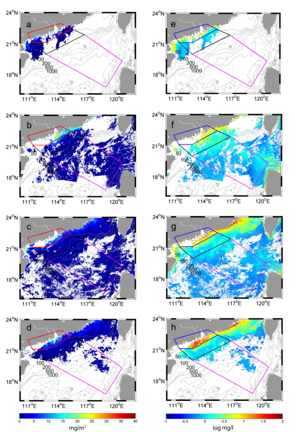 1. 悬浮物浓度(a-d叶绿素a浓度(e-h2018年9月15,18,20与21日空间分布。颜色的框线划分出了近岸、陆架及外海三个研究区域。数值等深线