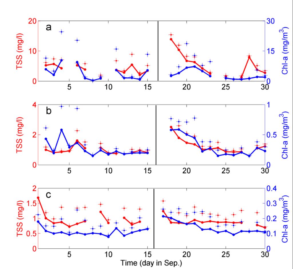 图2. 近岸(a)、陆架(b)及外海(c)三个研究区域叶绿素a(蓝线)与悬浮物浓度(红线)的时间过程曲线。+代表叶绿素a和悬浮物浓度的标准差。黑色竖线代表台风过境时间。