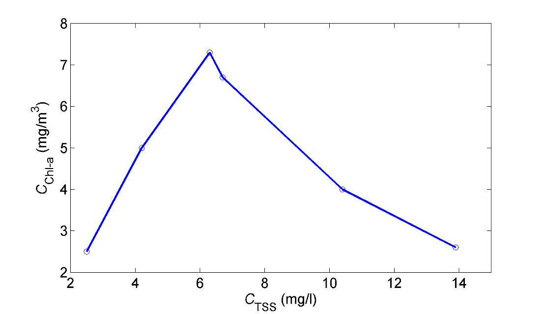 近岸、陆架及外海三个研究区域叶绿素a与悬浮物浓度的时间过程曲线(图2)显示出三个区域叶绿素a与悬浮物浓度增加特征并不相同。近岸区域受径流影响悬浮物浓度增加明显,但是叶绿素a浓度的峰值较悬浮物浓度延迟了5天。陆架区叶绿素a浓度与悬浮物浓度近似同步增加,并且发现该区域叶绿素a浓度在悬浮物浓度为6mg/l时达到最大(图3)。外海区悬浮物浓度基本没有变化,而叶绿素a浓度增加了一倍。