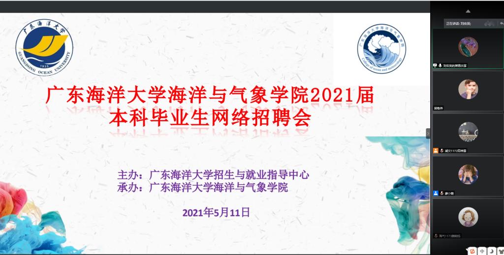 和各企业单位今后进一步开展深度合作。薛宇峰副院长介绍了学校和学院的发展概况,着重介绍了海洋科学、大气科学的学科建设、人才培养、以及社会服务等情况,指出了2021届毕业生面临的新的就业形势,鼓励毕业生抓住招聘会契机积极就业。分管毕业生就业工作的辅导员廖小霞对学生参加招聘会和积极主动就业提出了要求。随后,各用人单位按照会议安排有序进行宣讲,它们分别就公司背景、发展现状、招聘需求等内容为同学们做了精彩的讲解。