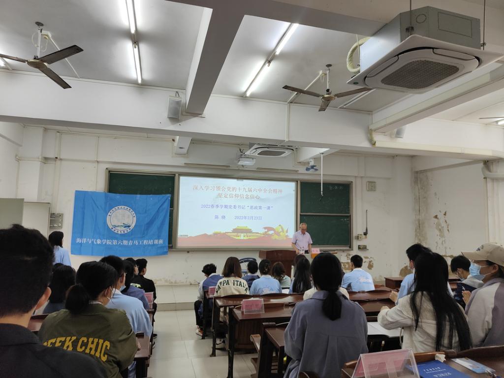 党委书记陈晓在钟海楼03020室为学院青马班同学以《深入学习领会党的十九届六中全会精神,坚定信仰信念信心》为题讲授第六期青马工程培训班青马第一课。