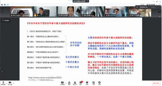 课堂中,谢玲玲院长向我们介绍了“中共中央关于党的百年奋斗重大成就和历史经验的决议。决议可以分为百年历史的四个时期、五大历史意义、十条历史经验和一个伟大号召。决议主要总结了党的百年奋斗重大成就和历史经验,突出了中国特色社会主义新时代这一中点,总结了五大历史意义,十条历史经验和一个伟大号召。