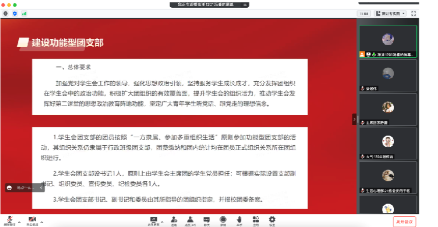 学生会功能型团支部成立大会于11月28日在腾讯会议线上召开,学院团委书记梁敬伟和学生会成员参加成立大会,会议由学院学生会执行主席冯睿主持。
