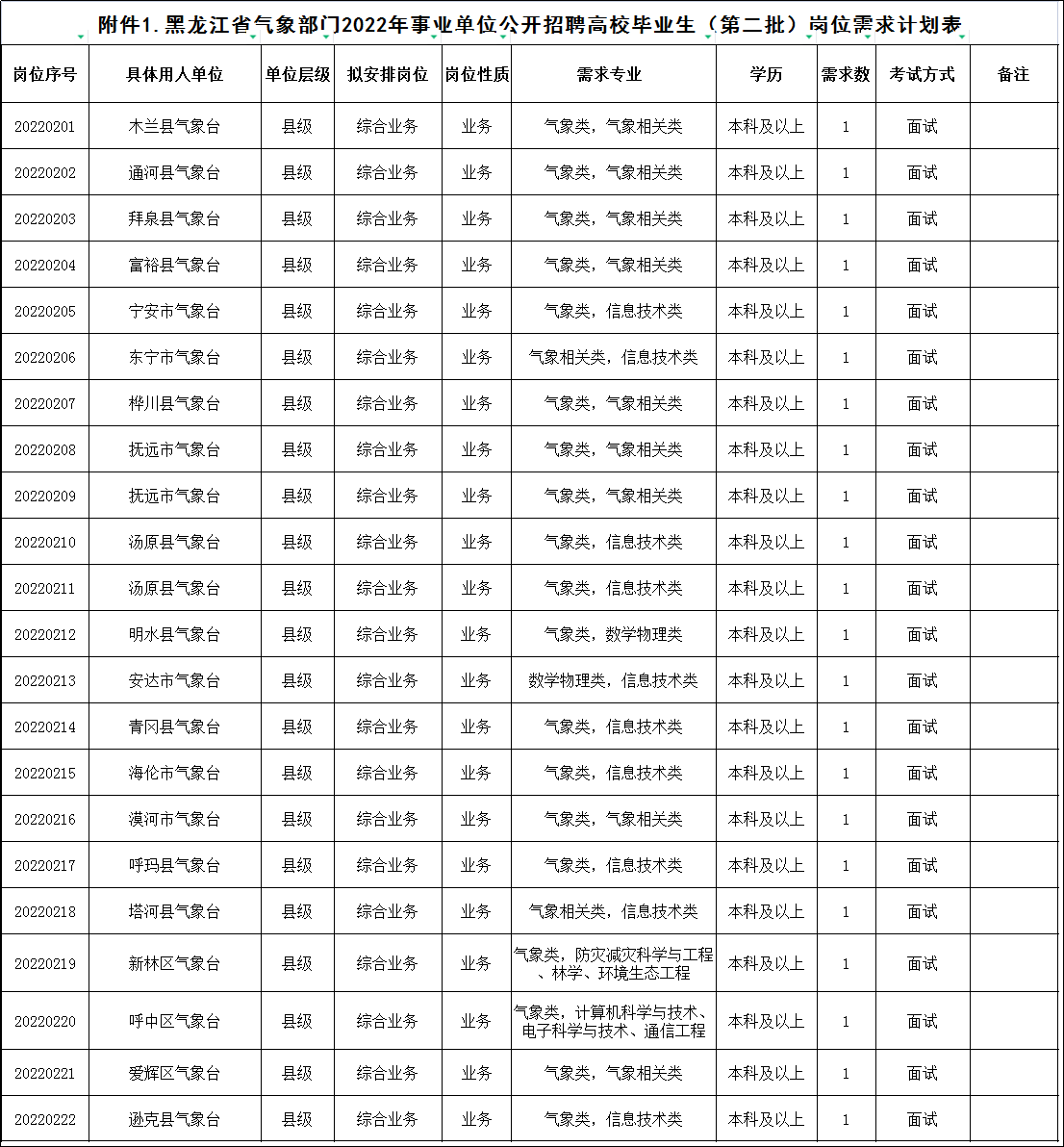 1.黑龙江省气象部门2022年事业单位公开招聘高校毕业生(第二批)岗位需求计划表