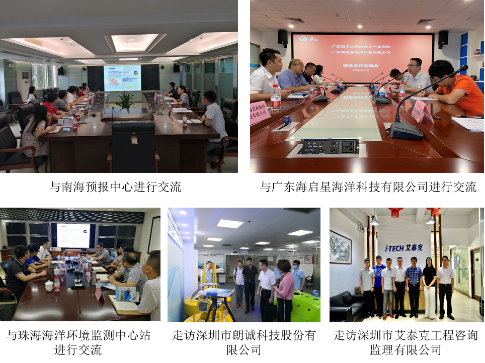 与各单位就各自发展现状、实习和就业基地建设、人才培养需求及建议等方面进行了深入的沟通和交流,并进一步协商了双方在人才培养、科学研究以及其他业务领域等方面的合作机制。调研加强了与自然资源部珠海海洋环境监测中心站等7家实习基地建设,与自然资源部北海海洋环境监测中心站、海口海洋环境监测中心站、汕尾海洋环境监测中心站、南海预报中心、广东海启星海洋科技有限公司和广东雷州珍稀海洋生物国家级自然保护区管理局等6家单位续签协议,与深圳市朗诚科技股份有限公司、深圳市艾泰克工程咨询监理有限公司和深圳市高亚弘信息咨询有限公司等3家单位达成了新的签约意向。