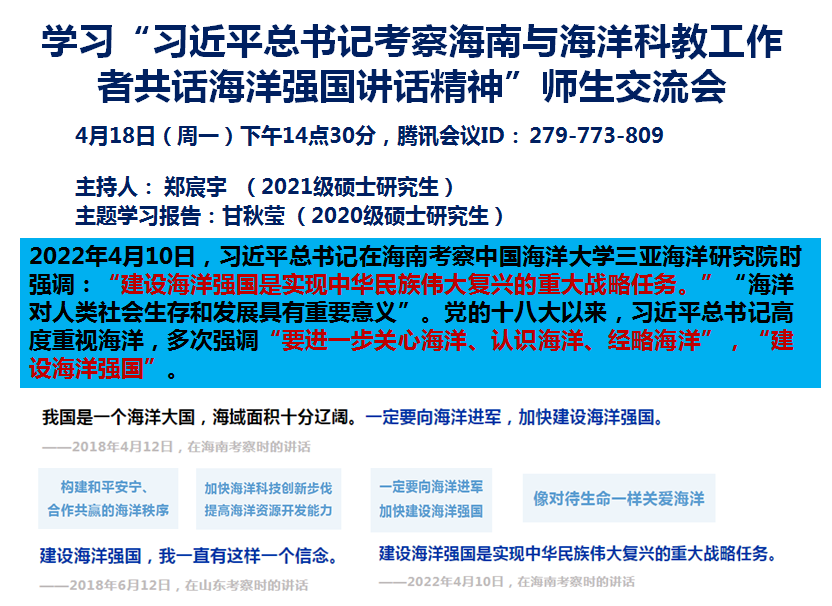 学院2020级硕士研究生甘秋莹同学首先带领大家一起学习了习近平总书记在海南考察期间与海洋科教工作者共话海洋强国讲话精神,以及党的十八大以来总书记关于“建设海洋强国”的相关重要论述。2022年4月10日,习近平总书记在海南省三亚市考察中国海洋大学三亚海洋研究院,了解发展海洋科技等方面的情况,总书记在考察时强调:“建设海洋强国是实现中华民族伟大复兴的重大战略任务。”党的十八大以来,习近平总书记高度重视海洋,多次强调“海洋对人类社会生存和发展具有重要意义”,“要进一步关心海洋、认识海洋、经略海洋”,“一定要向海洋进军,加快建设海洋强国”。习近平总书记到中国海洋大学三亚海洋研究院视察,充分体现了总书记对海洋强国建设的高度重视。