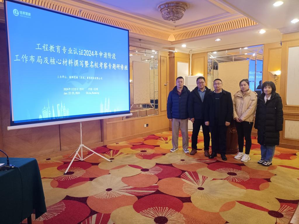 2024年1月22-25日,H视频 多名骨干教师,充分利用假期放假时间,在系副主任谢辉的带领下,远赴昆明参加了由铭师慧新(北京)教育科技有限公司主办的“工程教育专业认证2024年申请阶段工作布局及核心材料撰写暨名校考察专题研修班”。