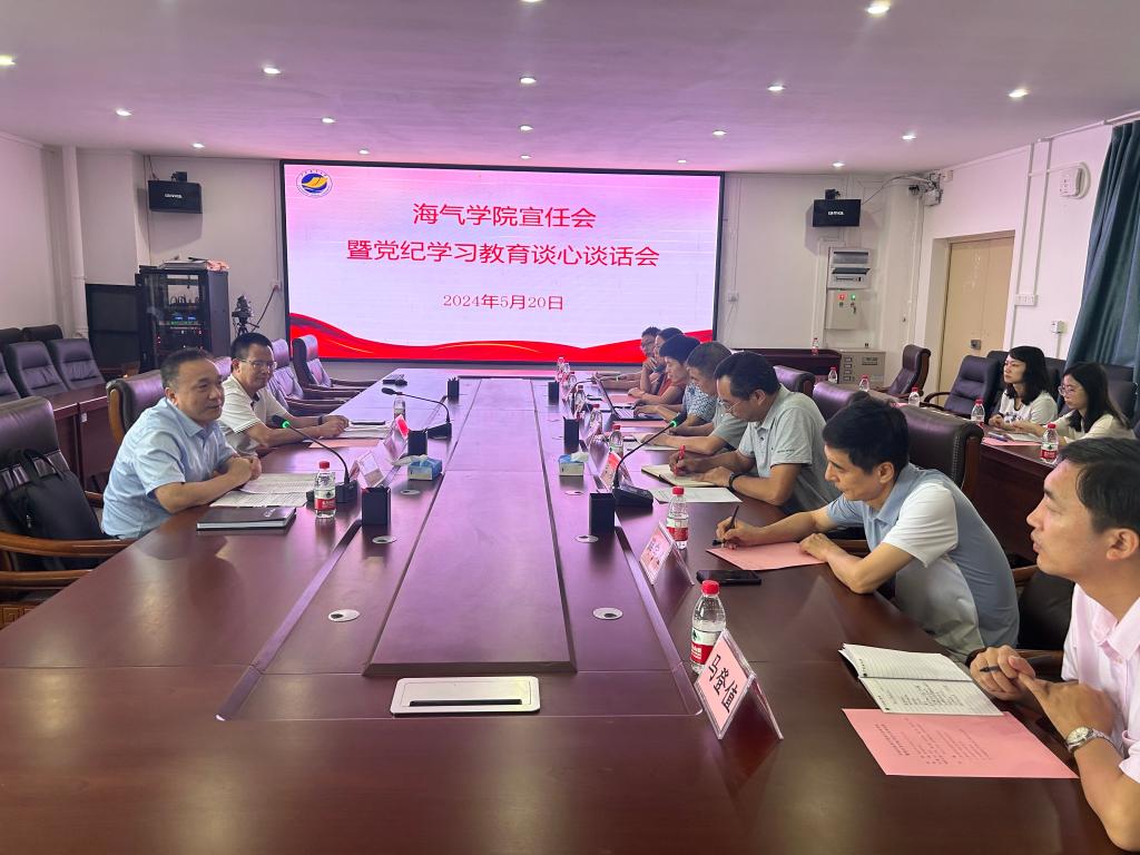 在海科楼505室召开干部宣任暨党纪学习教育谈心谈话会,学校党委常委、副校长宁凌、党委组织部部长曾庆新出席会议,学院领导班子、副科以上干部、教师代表参加,学院党委书记毛琪主持会议。
