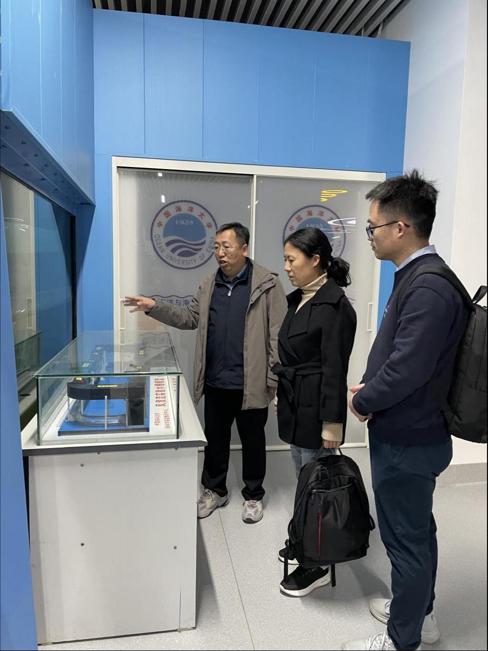 当天下午,侯庆华、胡耀强、李敏一行三人专程参观了中国海洋大学海洋学国家级实验教学示范中心。海洋与大气学院副院长陈旭热情接待了来访的三人。他深入浅出地讲解了学院的发展历程,详细介绍了先进的海洋调查设备和多种创新型流体力学设备,并分享了实验室高效运行的管理模式与创新举措。双方就本-硕-博贯通的海洋科学实践创新型人才培养体系设置、课程优化、教学手段及管理模式进行了深入的探讨。