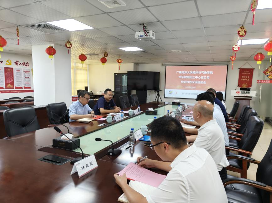 在中华联合财产保险股份有限公司阳江中心支公司,双方围绕人才培养、教学科研合作展开深度探讨。学院基于海洋气象大数据、数值预报模式和人工智能应用,提出联合培养人才、开展金融气象、农业气象精准服务等合作研究;中华财险阳江中支积极响应,承诺推进战略合作,瞄准数字金融化,共同探索“保险+气象+海洋”服务地方经济的新路径。