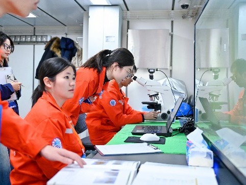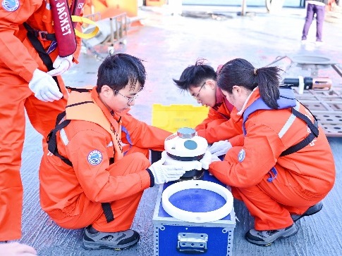 总决赛期间,代表队登上6000吨级“东方红3”科考船,与来自中国海洋大学、厦门大学、中山大学、河海大学等全国10支参赛队伍同台竞技。本次大赛涵盖物理海洋、海洋化学、海洋生物和海洋地质四大方向,设置甲板和船上实验室两个考核板块。甲板操作包括SBE911plus CTD观测及采水、化学水样现场分取、箱式采泥器表层沉积物取样、浮游生物垂直拖网以及海床基组装等5项内容;实验室内考核包括海水pH测定、浮游植物鉴定(种水平)、表层沉积物描述及船载观测仪器认知共4项内容。考核内容兼顾实践与理论,覆盖面广、工作量大、操作要求高,且需在5.5小时内完成全部项目;同时受当日4级海况影响,整体难度进一步加大。H视频