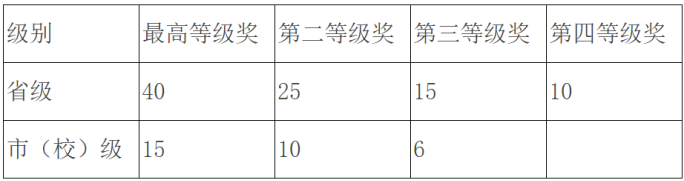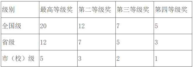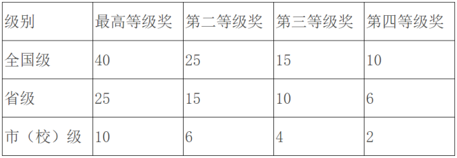 各类奖项完成者中排名第二至第五的学生分数分别=排名第一分数×0.6、0.5、0.4、0.3。同一项目获不同级别奖励,不重复计分。