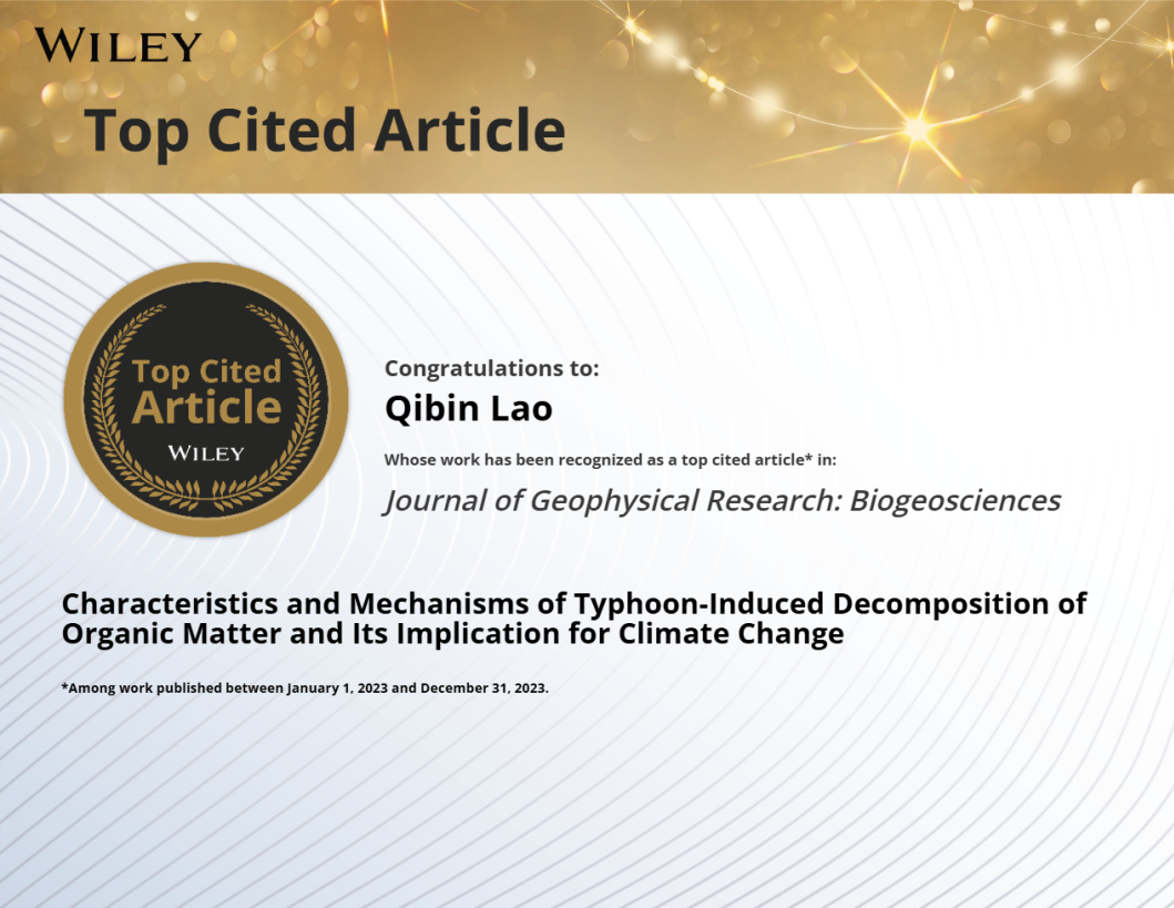 Lao, Q., Chen, F.*, Jin, G., Lu, X., Chen, C., Zhou, X., & Zhu, Q. (2023). Characteristics and mechanisms of typhoon‐induced decomposition of organic matter and its implication for climate change. Journal of Geophysical Research: Biogeosciences, 128(6), e2023JG007518. //doi.org/10.1029/2023JG007518