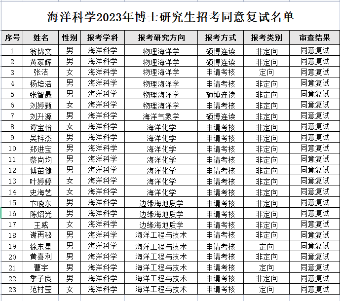 根据我校博士研究生招生录取有关文件的规定,结合《海洋科学学科2023年硕博连读与申请考核 招收博士研究生工作实施细则》的相关要求,现对海洋科学博士招考学生资格审查结果予以公示。
