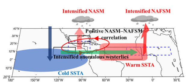 Luo Jianzhou(本校研究生), Weng Jinwen(本校研究生), Luo Weijian(本校研究生), Wang Lei*(通讯作者). Interannual synchronizationoftheNorth Americansummer monsoon and theNorthAtlantictropicalcyclonegenesisfrequency[J]. Environmental Research Letters, 2024, 19: 054034.