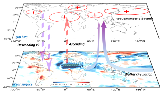 大规模光伏发电站的建设不仅对区域和全球气候、生态环境造成影响,也会扰乱太阳辐射的自有分布规律,引起全球太阳能的重新分配对全球太阳能分布、规划和未来的建设产生影响。该研究利用海洋、大气、生态耦合的地球系统模式,基于光伏板降低地表反射率的假设,在撒哈拉沙漠中设置覆盖面积为5%,20%和50%的大型光伏发电场。结果表明,撒哈拉地区大规模光伏发电场建设对包括北非(局地)、中东、南欧、印度、中国东部、日本、澳大利亚东部和美国西南部的太阳能生产可能产生的负面影响,对中南美洲、加勒比地区、美国中部和东部、斯堪的纳维亚和南非产生积极影响(下图)。这主要是由于大规模光伏板降低沙漠下垫面反照率造成撒哈拉局地增温,强迫全球大气环流发生变化、影响全球的云量覆盖,进而引起各地地表太阳直接辐射发生改变。该研究揭示了撒哈拉沙漠大规模光伏电站建设对全球太阳能获取和开发的影响及其可能机制,预示着能源开发可能通过气候系统反馈引起的其他地区能源利用的不平等性。该研究成果将发表在Nature旗下期刊Communications Earth & Environment。研究在Tech Xplore,PV Magazine,The Conversation,Science Alert,Geography Directions等10余家媒体平台报道、转载和评论,得到国际媒体广泛关注。