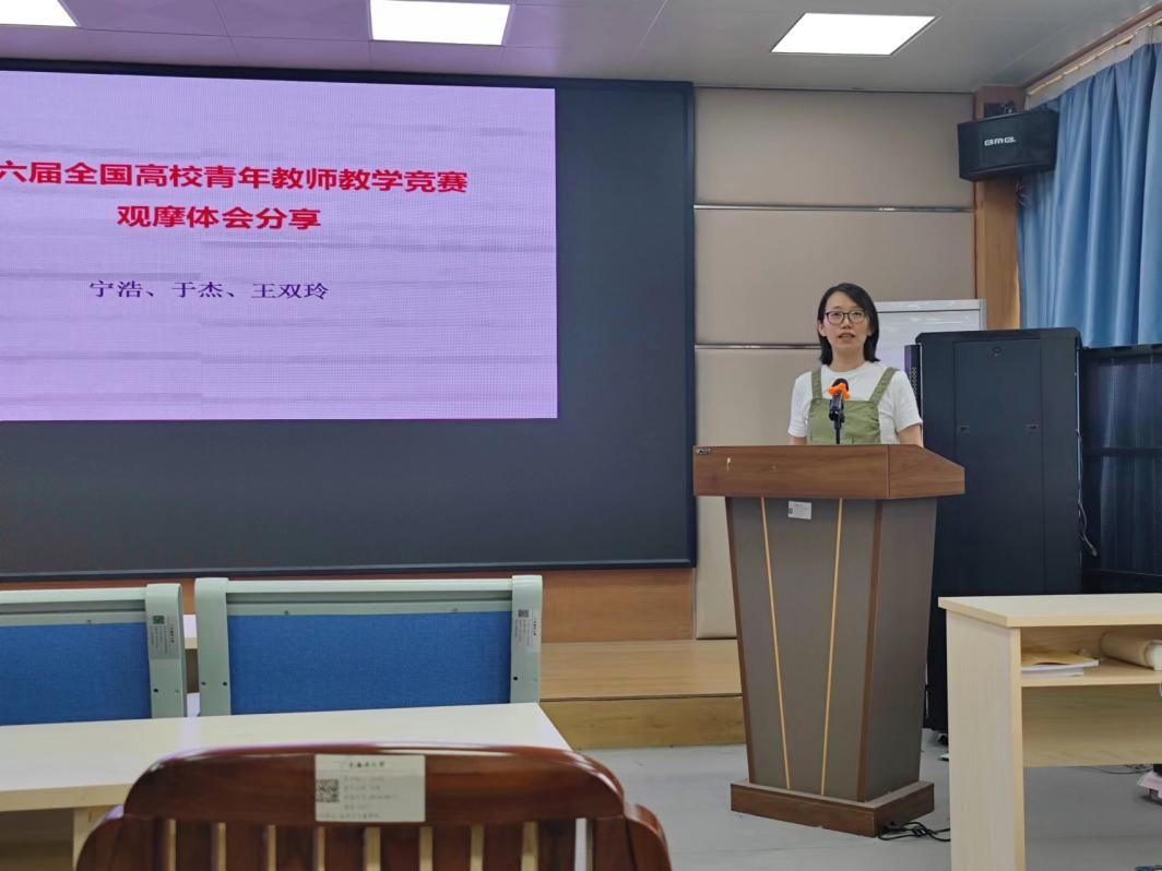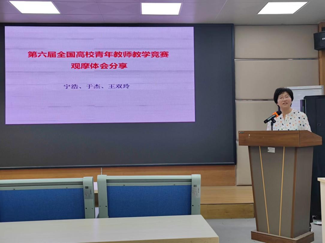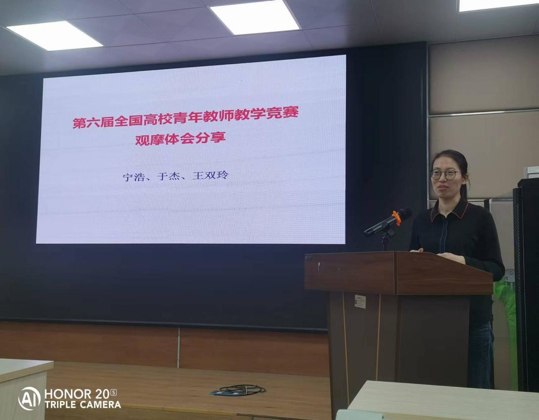 教师王双玲、于杰、宁浩分别结合第六届全国高校青年教师教学竞赛的观摩体会,分享了现代化信息技术在课堂中的应用、课程思政的设计及融入技巧、教学内容的高阶性与创新性设计等经验。