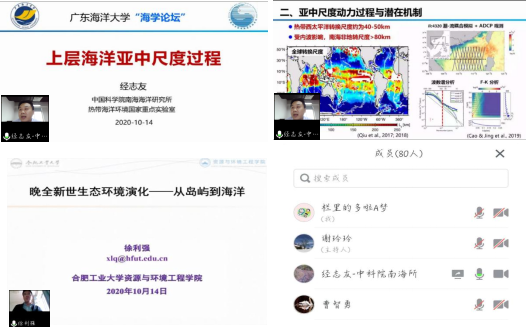 举行了第九期海学论坛,这次论坛有幸邀请到了中科院南海海洋研究所的经志友研究员以及合肥工业大学资源与环境工程学院的徐利强副教授。论坛由院长谢玲玲主持,海洋科学系的孔德明老师从旁协助,采用线上进行的方式,学院及学校部分师生参会人数共80余人。