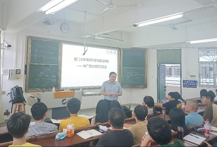 9月25日,蔡明刚教授旁听了学院副院长陈法锦教授主讲的本科生课程《海洋生物地球化学》,接着,蔡教授结合课程教学大纲内容,做了主题授课。在课堂上,蔡教授从地球系统科学的角度介绍了海洋环境污染问题的本质,深化同学们对海洋生物地球化学的认识,增强了同学们利用地球科学系统的思维去研究海洋问题的能力。最后,还与同学们积极互动,引导大家深入思考。通过蔡教授的指导,H视频