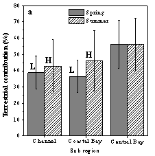 图2 春季和夏季湛江湾不同子区域陆源和海源有机质的输入比例