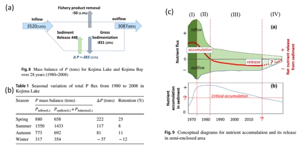 (a) 28年见近海磷收支模型,(b)沉积物对磷蓄积释放的季节性特征,(c) 近海沉积物临界蓄积量对富营养化治理响应的4个过程